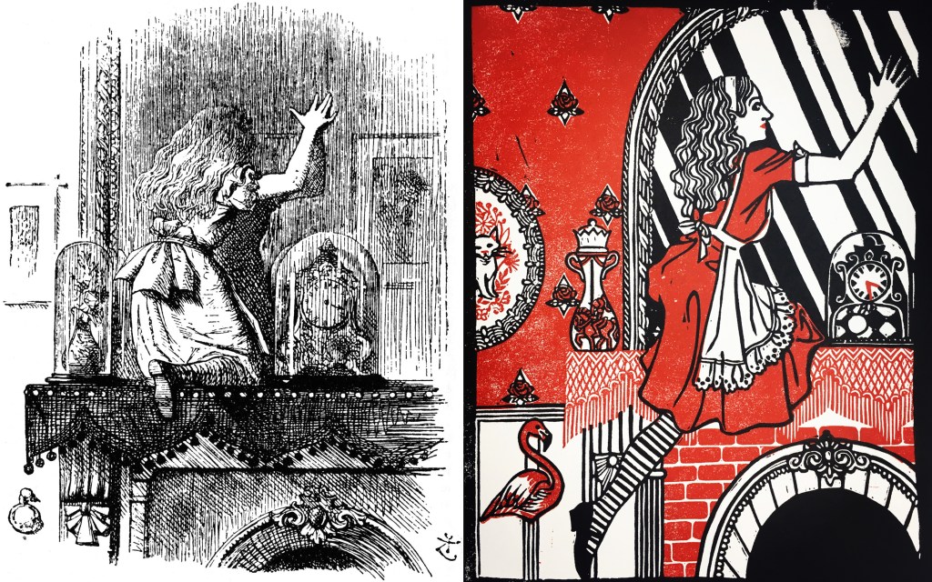 I just finished my Through the Looking Glass print and dropped it off at Public Space One! In case you haven’t heard, it’s a print that I did for the show “Osmotic Radiance,” which will be up at FilmScene (hanging in the west side windows, facing the street) this coming weekend and next week. The prompt for the show was obviously “Osmotic Radiance,” and I used it to come up with my concept. The print is taken from Sir John Tenniel’s original illustration.