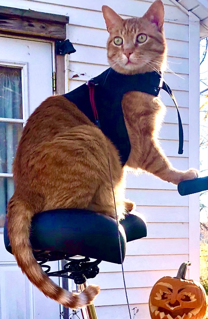 He is FIV+ which means that he’s more prone to infections than other cats, and shouldn’t be allowed around non FIV+ cats (to keep it from spreading). He loves to play, snuggle, eat, and watch for mice in the wall. He also loves to be outside, and surprisingly took to a leash right off the bat, so I take him on walks around the yard a lot. Unfortunately, he can get overstimulated quickly by the smell of another cat or the sound of a passing vehicle, added to that the fact that bird flu is practically surrounding us at this point, he’s pretty much an indoor cat only. I had a stroller that I outfitted for him a while ago, but it was way too big to bring to my new place, so I’ve actually just recently ordered one that folds up really small. Can’t wait to take him on walks without fear of being scratched to shreds.